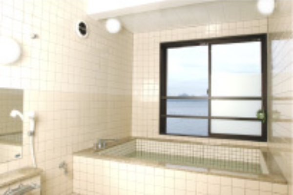 窓の外に海が見える、男女別大浴場(シャワー蛇口3つ)がございます。ダイビングの疲れもゆっくりとってください。気持ち良いこと間違いなしの大浴場です。